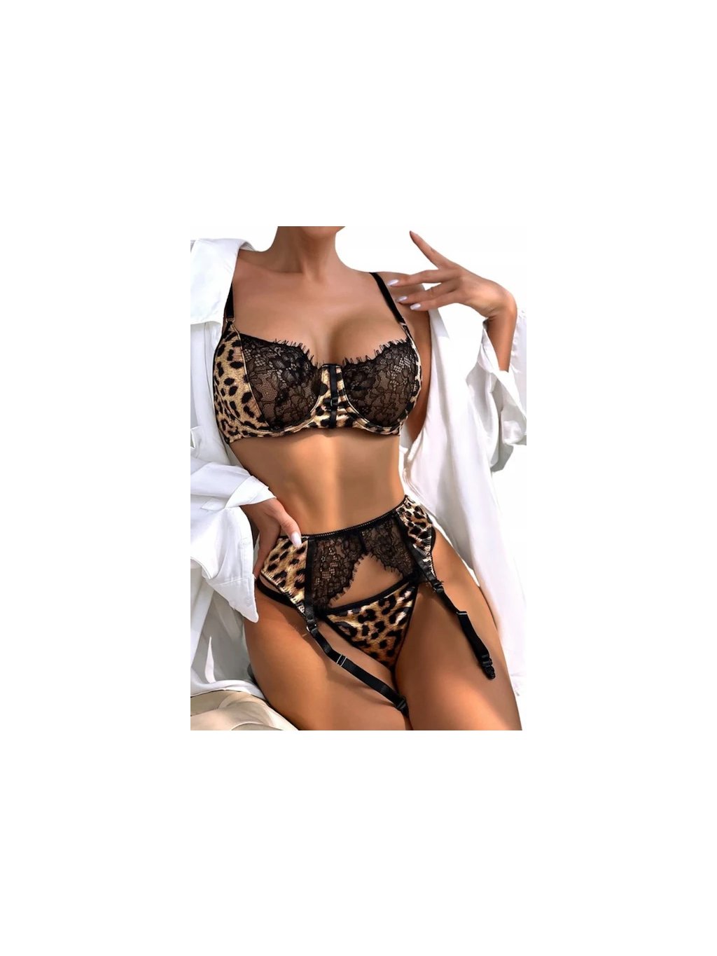 Zahaľ sa do zmyselnosti a sebavedomia s kompletom „Wild Desire“. Leopardí vzor spojený s čiernou čipkou vytvára neprehliadnuteľný kontrast divokosti a ženskosti. Perfektný výber pre každú femme fatale, ktorá sa nebojí ukázať svoju silu aj zvodnosť.